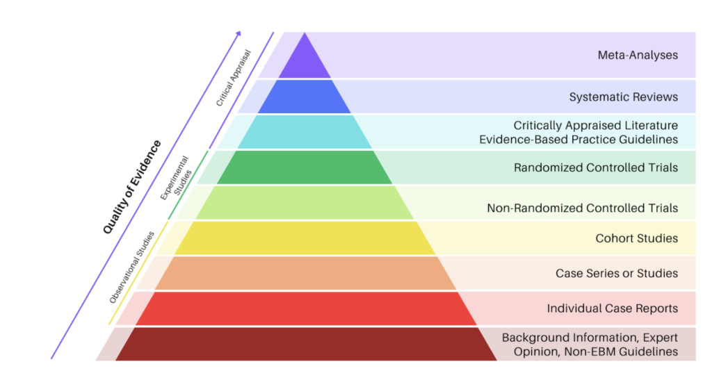 To evaluate as an owner if a clinical trial is good, it is helpful to use the Hierarchy of Evidence as seen below. The tip of the pyramid shows the best value and best quality data and study type. The bottom of the pyramid shows the least valuable information.