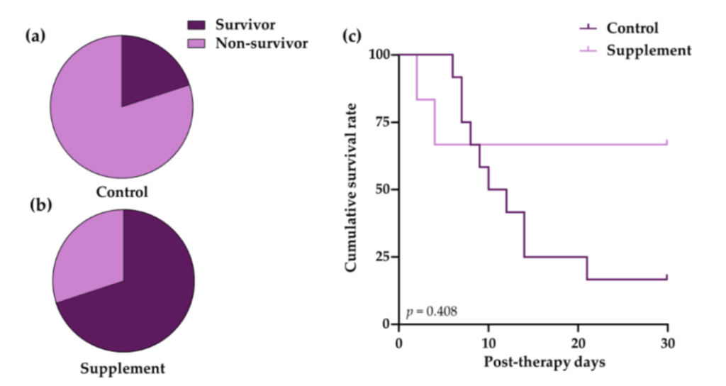The mortality rate was higher in the control group than the supplement group, and the survival rate declined to 16.7 at 28 days post-therapy, whereas in the supplement group, the survival rate was much higher, at 66.7 throughout the study.