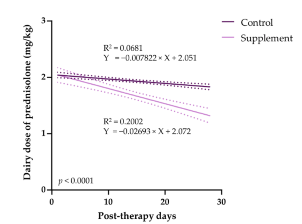 The number of dogs able to taper their prednisolone dose was higher in the supplement group. EAB-277-supplemented dogs had 4.20 times the tapering rate compared to the control group.