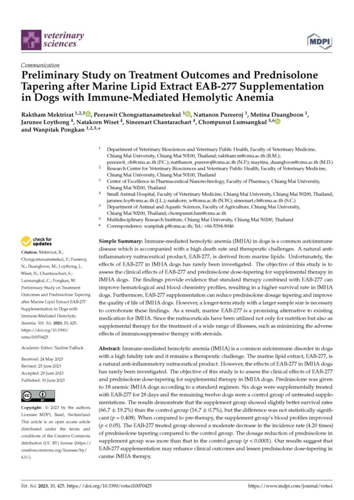 Immune-mediated Hemolytic Anemia (IMHA) is a complicated, life-threatening disease causing dogs to become rapidly anemic, with widespread inflammation. Survival rates are low, but treatment development is still ongoing. Veterinarians usually start with corticosteroid treatments, which are effective but come with unpleasant side effects. This study aimed to investigate using EAB-277 (Antinol Rapid), a marine-lipid fatty acid extract, to improve the clinical outcomes for dogs with IMHA.