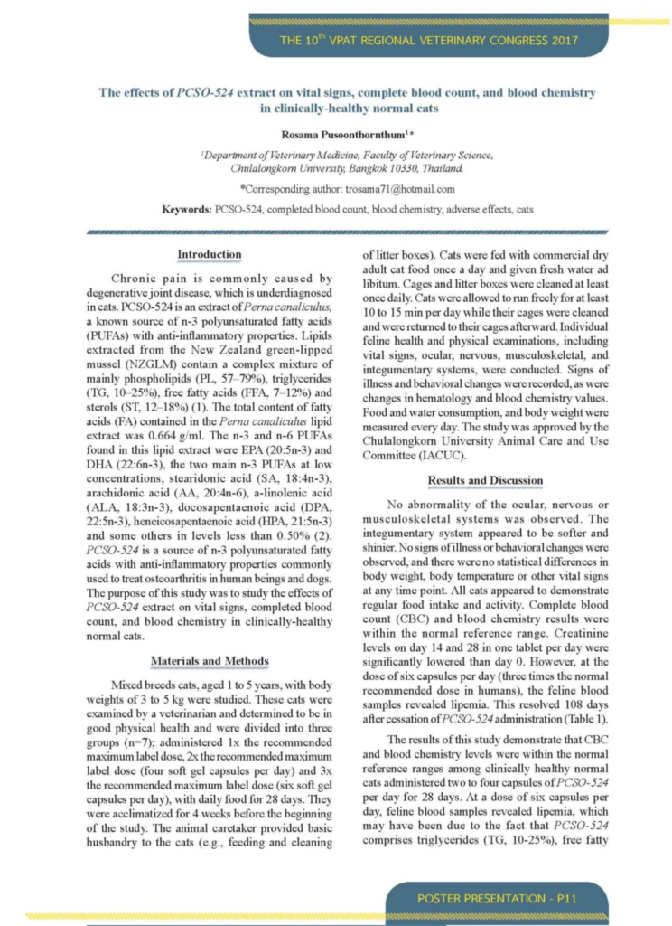 Across all three groups, there were no significant changes in any of the parameters measured during the trial, except for in the highest dosage group, where the cat’s showed some signs of lipemia. This resolved 108 days after the cessation of PCSO-524 administration.